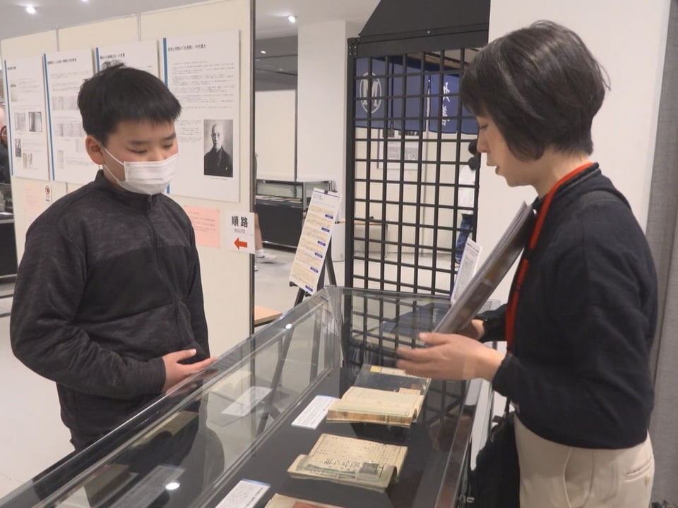 会場に訪れた山県市立美山小学校の6年生の児童らはケースを覗いて資料を見ながら、日本の近代化を支えた地元の偉人への理解を深めていました。