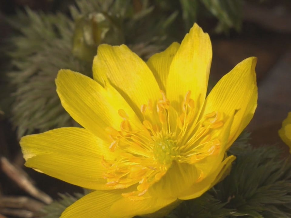 フクジュソウは、キンポウゲ科の多年草で、太陽の光を浴びて3センチほどの黄色い花を咲かせるのが特徴です。
