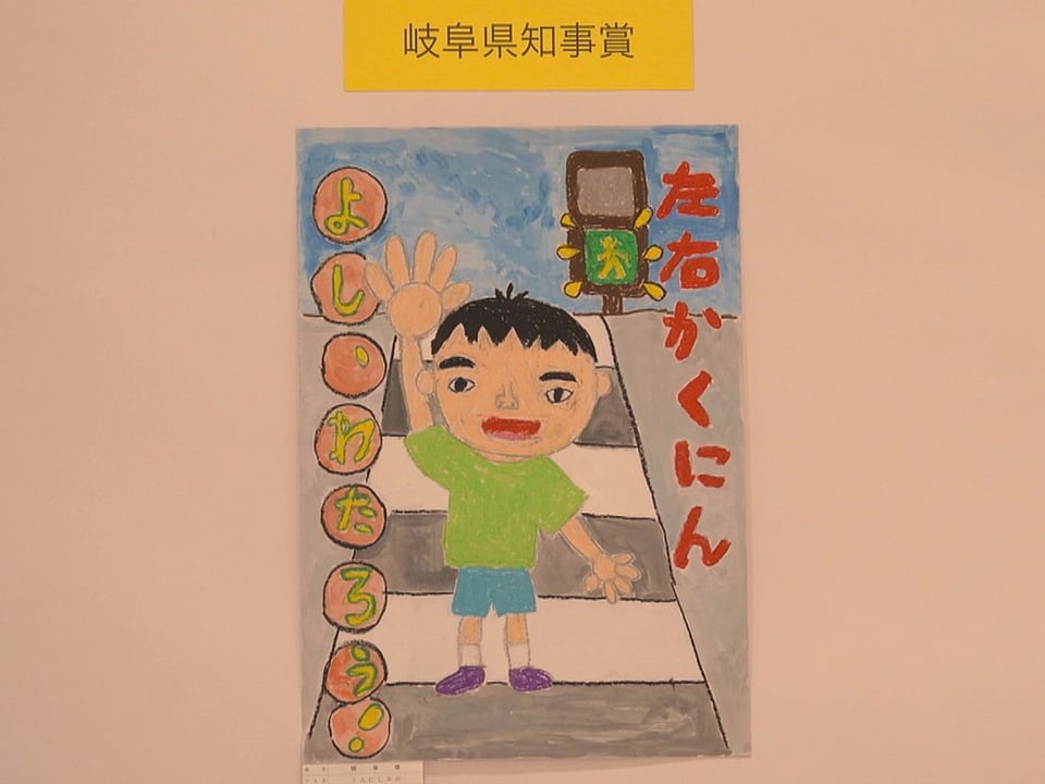 このうち、書道の県知事賞にはエネルギッシュに「やさい」と書いた岐阜市の黒野小学校1年の岩崎桔平さんの作品など4点が、交通安全ポスターの県知事賞には、「左右かくにん よし、わたろう!」のメッセージとともに手をあげて横断歩道を渡る姿を描いた大垣市の墨俣小学校2年の西垣祐星さんの作品と、シートベルトの重要性を訴える瑞穂市の穂積中学校1年の東山新さんの作品が選ばれました。