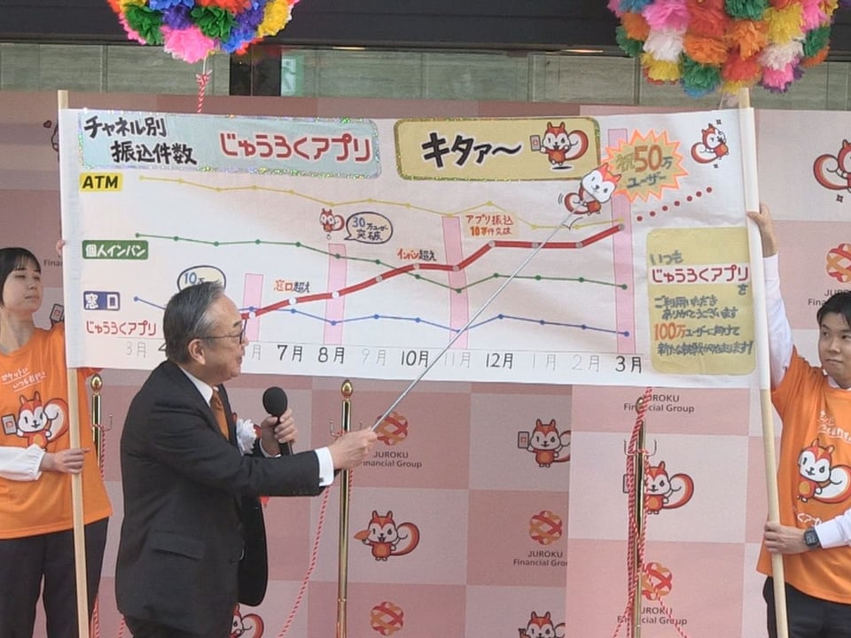 十六フィナンシャルグループ(FG)十六銀行のスマートフォン用バンキングアプリ「じゅうろくアプリ」のユーザーが50万人を突破、岐阜市内で記念セレモニーが開かれました。