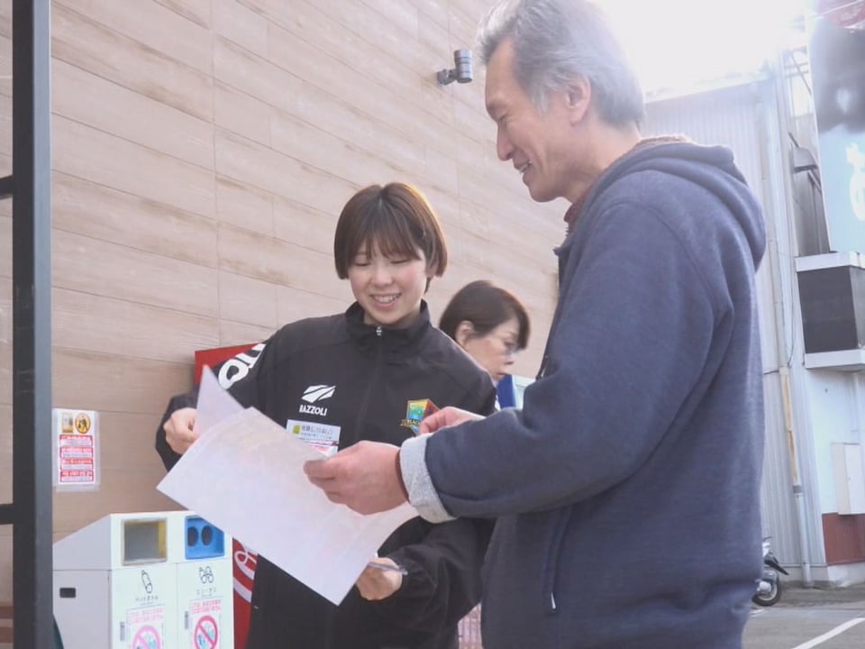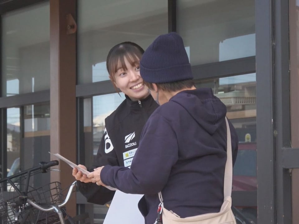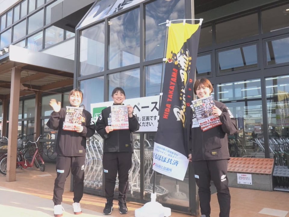 高山市の駿河屋アスモ店では、選手たちが買い物客に「ブルズの応援をお願いします」と、声をかけながらチラシを手渡しました。