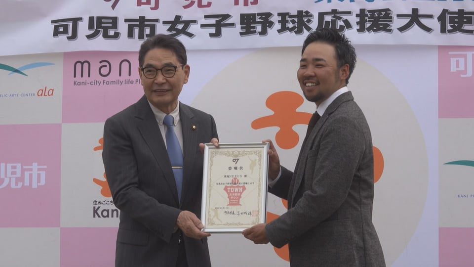 また、認定を受け、愛知県一宮市が拠点の女子野球チーム東海NEXUSが「可児市女子野球応援大使」に任命され、市長から碇穂監督に委任状が手渡されました。
