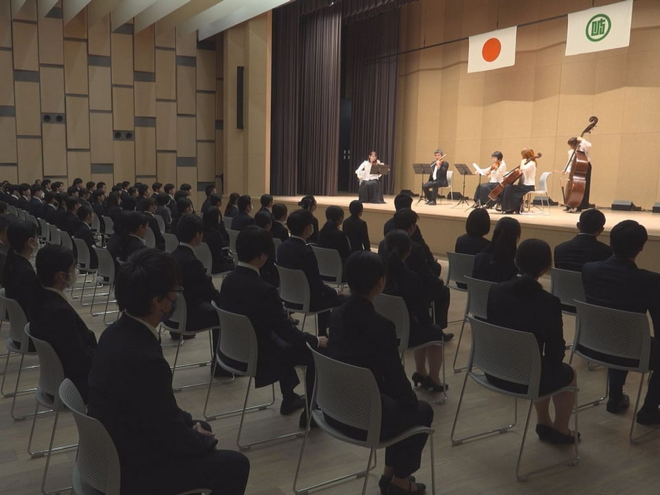 式では、県交響楽団の団員が弦楽5重奏の演奏を披露して、新人職員を歓迎しました。