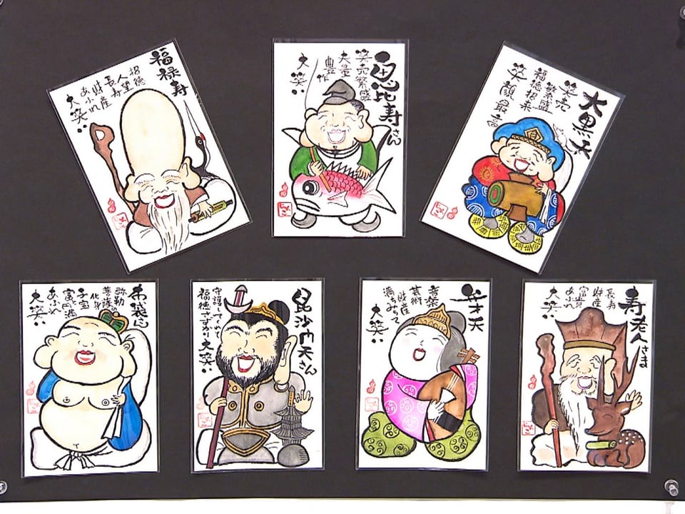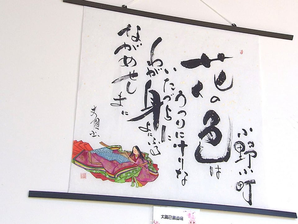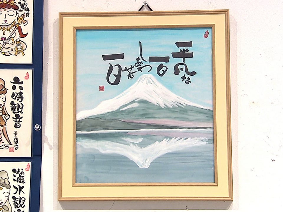 会場には約800点が展示され、七福神をはじめ、富士山などの風景や花などのイラストに文字アートを合わせた作品や、和歌をその人なりにアレンジして表現した作品などが飾られています。