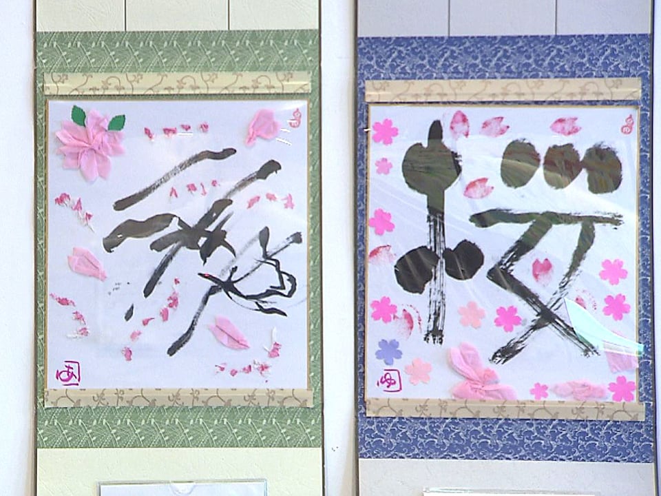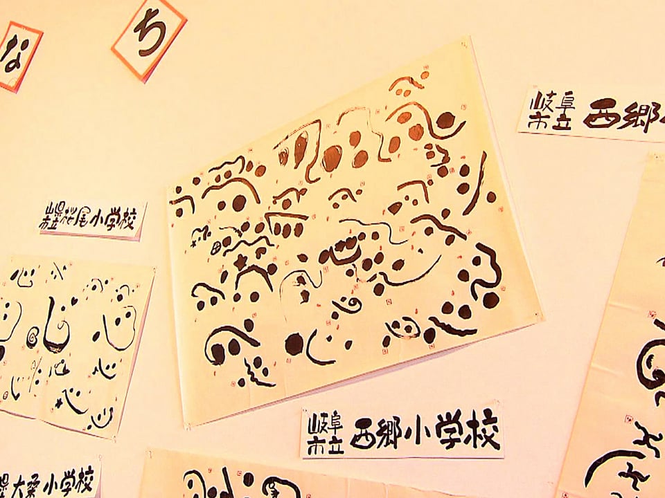 筆ペンで自由に表現する文字アート「己書(おのれしょ)」の作品展が3日、岐阜市のみんなの森ぎふメディアコスモスで始まり、思い思いに描かれた心温まる作品が訪れた人たちを楽しませています。