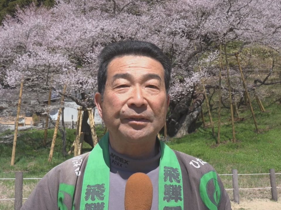 「臥龍桜2日前に開花をしまして、ごらんの通り8部9分咲きとなっています。見ごろは今週末、土日が最高だと思います、どうかご来場をお待ちしています」