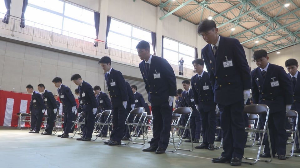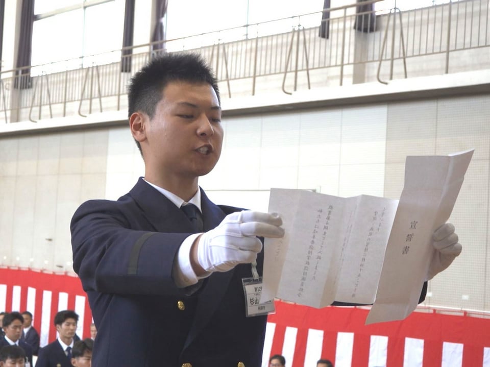 入校式で、山田悦司校長が「消防は住民の生命・身体・財産を守る仕事。そのためにここで学ぶことを忘れないでいただきたい」と激励。初任科生を代表して飛騨市消防本部の杉山颯太さんが誓いの言葉を述べました。