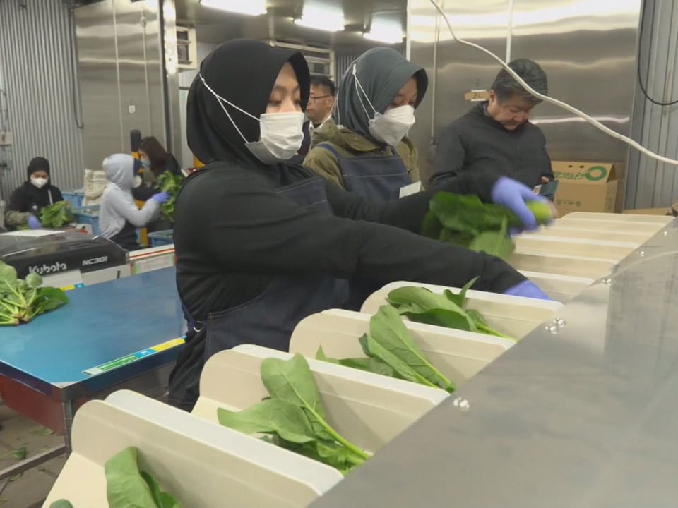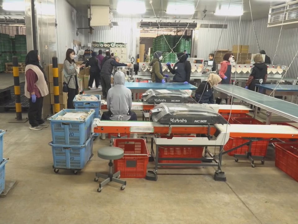 センターで作業を担うのはインドネシアの特定技能外国人で、不要な葉を取って根を切りそろえる最新の下葉調整機や自動計量器、包装機などを使って手際よく一連の工程を行っていました。