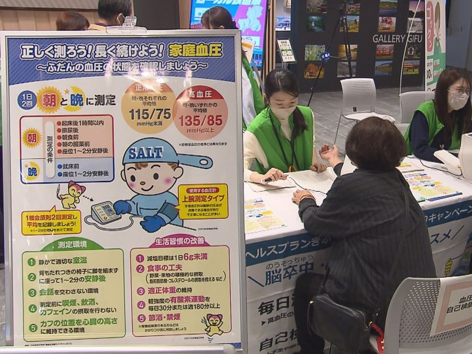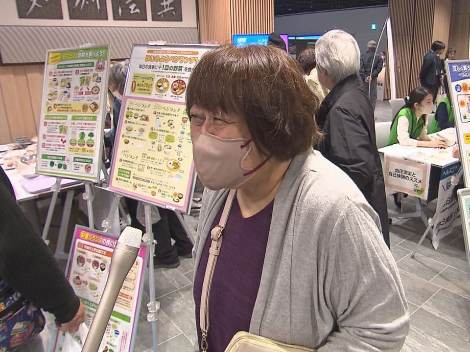 また会場の一角には、県の「野菜ファーストプロジェクト」の一環として、野菜をたっぷり取ってしっかり減塩する食事バランスの体験ブースや、血圧測定などのコーナーも設けられ、買い物帰りの人が立ち寄っていました。