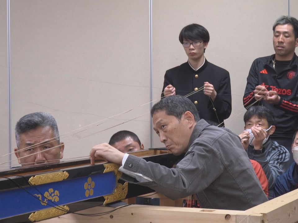 4月初旬からは、祭屋台のからくり人形を操る青龍台組の木偶保存会の高校生から60代までの34人が連日、稽古に励んでいます。