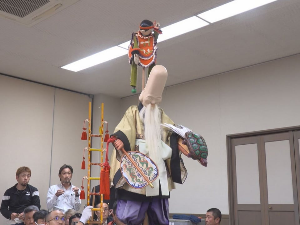 高さ約90センチの福禄寿と約40センチの唐子が登場する青龍台のからくりは、10人一組で糸を巧みに操り、唐子が福禄寿の肩に梯子を架けて登る場面が見どころです。