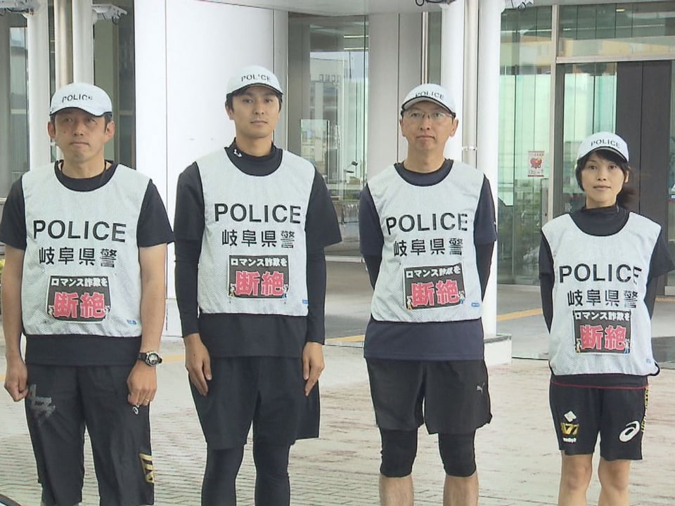 サイクルポリスの4人も合わせてビブスに「ロマンス詐欺を断絶」などと掲げ、市民ランナーらに詐欺被害の防止も呼びかけます。