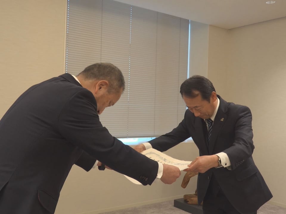 県庁を訪れた志田 浩一運営委員会会長が目録を江崎 禎英知事に手渡し、続いて知事から感謝状を受け取りました。