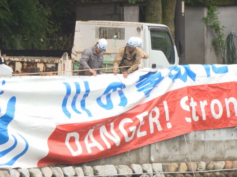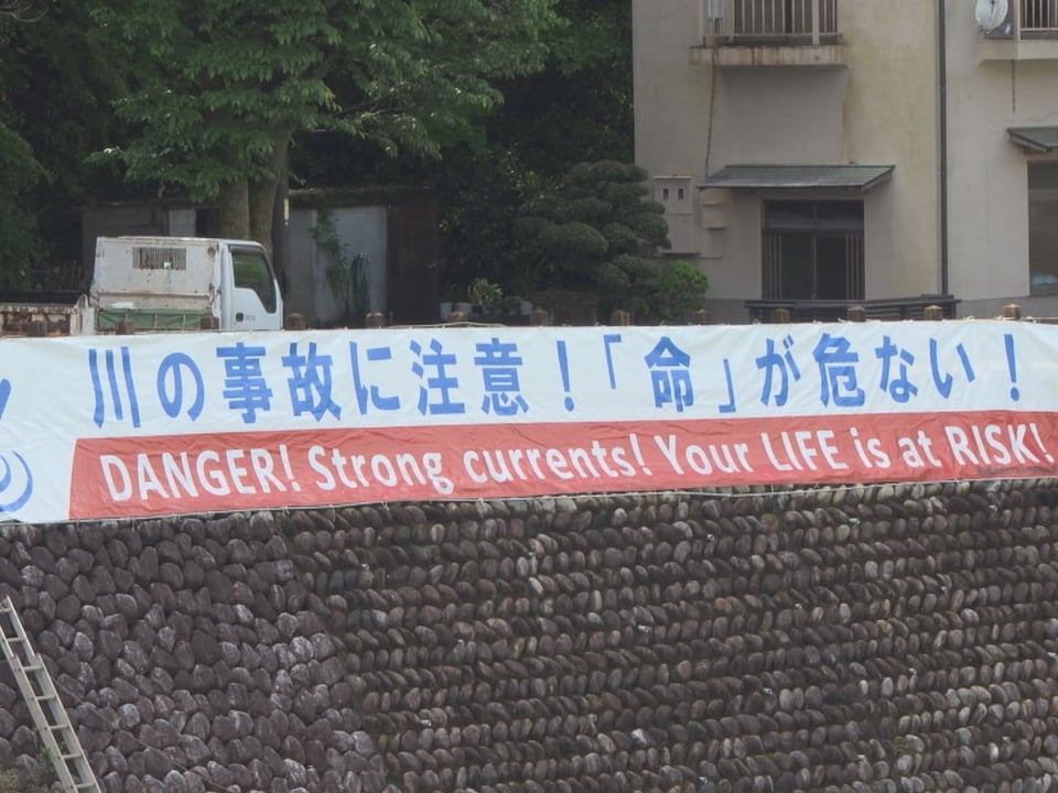 横断幕は、縦2メートル、横22メートルの大きさで『川の事故に注意!「命が危ない」!』と注意喚起し、近年、外国人の水難事故も相次いでいることから英語でも表記されています。