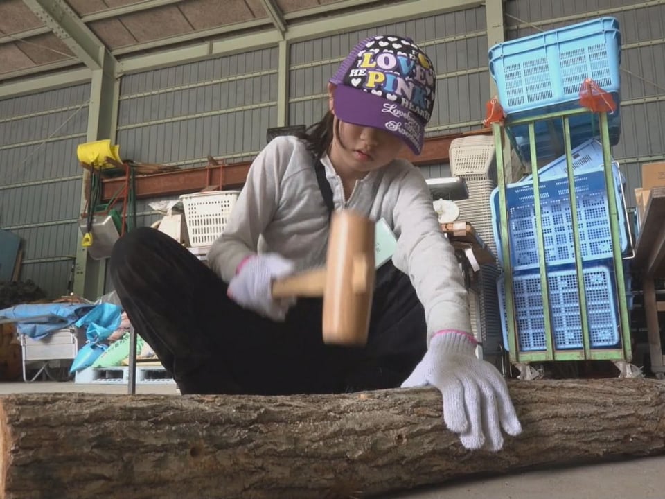 最初の授業では、子どもたちは地元で農業を営む「農家先生」に教わりながら、包丁を使ってジャガイモの種イモの準備や、クヌギやコナラの原木に開けられた穴に、シイタケ菌が付いた木片を打ち込む菌打ちを体験しました。
