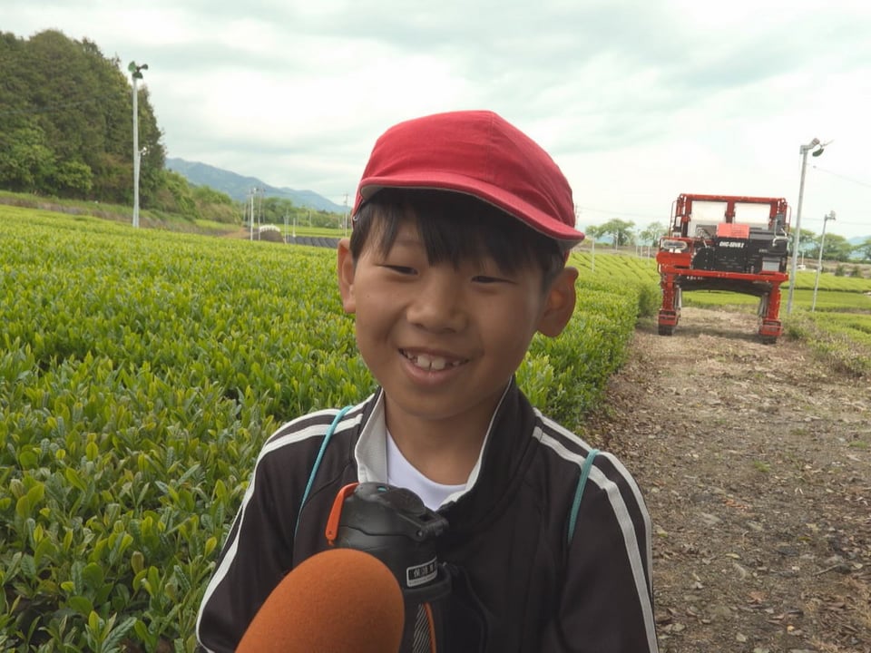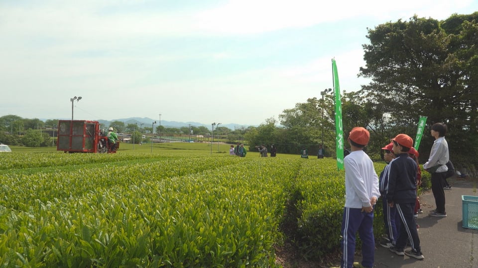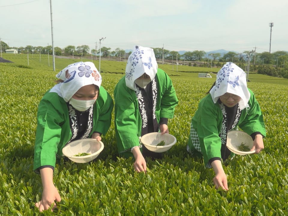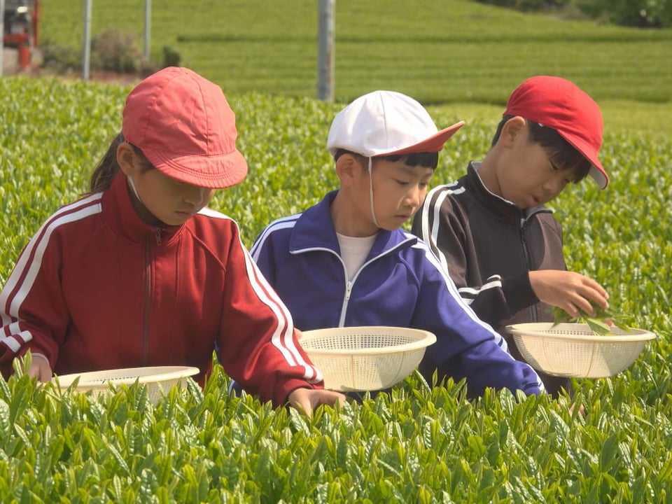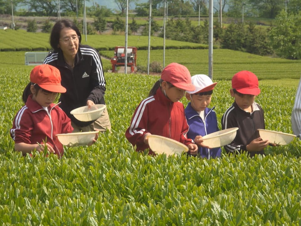 鮮やかなもえぎ色の茶畑では、法被姿の町の職員や地元の小学校の児童らが新芽を手摘みしました。