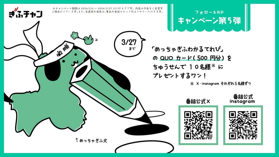 3/27(金)までに、番組公式XやInstagramをフォローし、対象の投稿をリポストをすると、抽選でXとInstagramそれぞれ5名様に”番組特製QUOカード500円分”が当たるチャンスです!ぜひ参加してください!