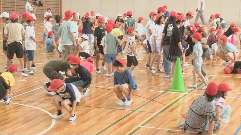 楽しみながら体を動かす習慣を身に付けようと人気テレビ番組を参考にして始まった中島小の全校遊びの様子を紹介。