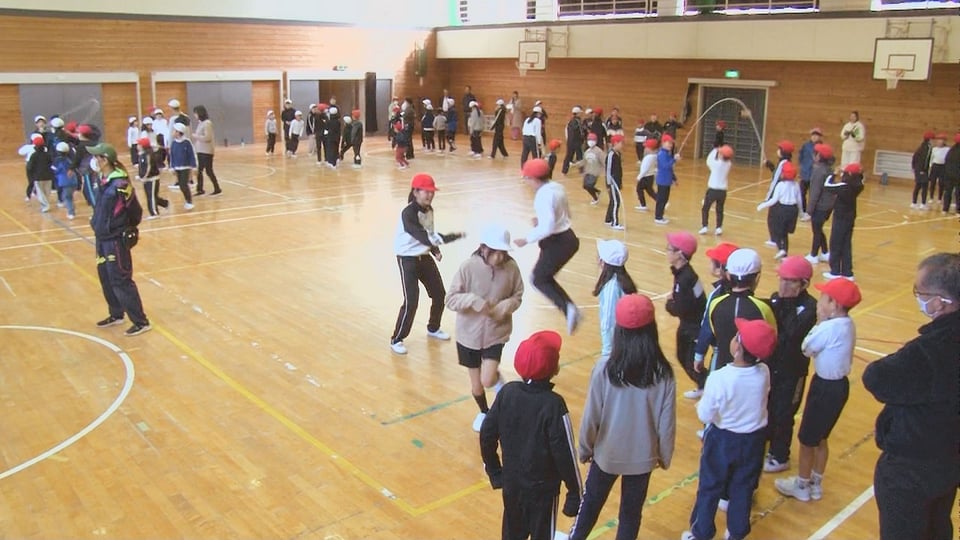 口明方小では、年間を通して縦割りグループで様々な活動をしている。異学年の児童らが協力して8の字飛びに取り組む様子を伝える。
