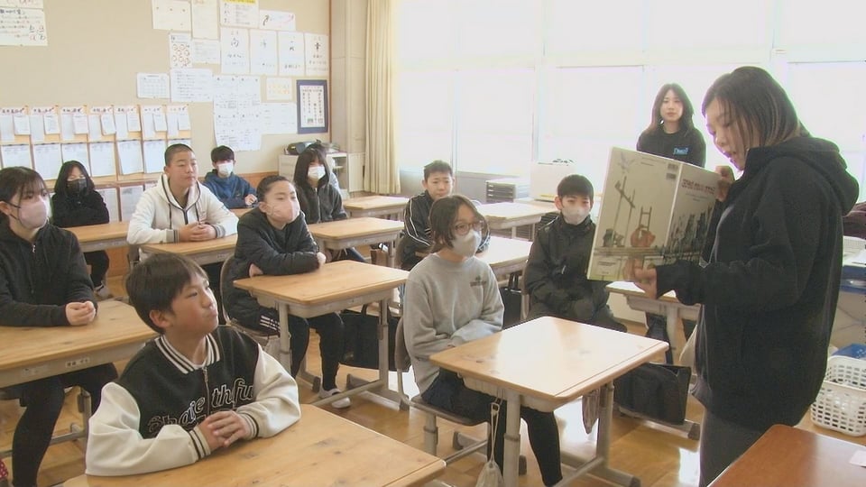 地元のボランティアグループによる本の読み聞かせ授業の様子を伝える。